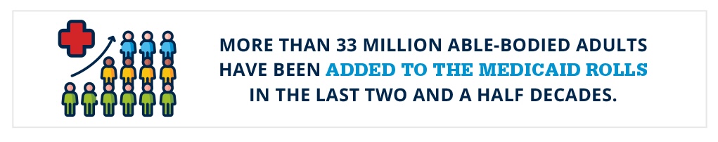In 2000, there were roughly 35 million Medicaid enrollees nationwide—including nearly seven million able-bodied adults.7 Since then, Medicaid enrollment peaked at 100 million in 2023—a record high.8 Even worse, according to Centers for Medicare & Medicaid Services (CMS) more than 33 million able-bodied adults have been added to the Medicaid rolls in the last two and a half decades—a massive jump fueled by Medicaid expansion.9-10